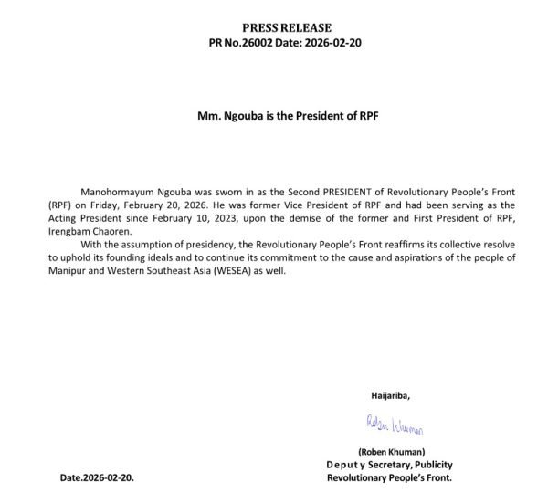 Manohormayum Ngouba was sworn in as the Second PRESIDENT of Revolutionary People’s Front (RPF) on Friday, February 20, 2026. He was former Vice President of RPF and had been serving as the Acting President since February 10, 2023, upon the demise of the former and First President of RPF, Irengbam Chaoren.